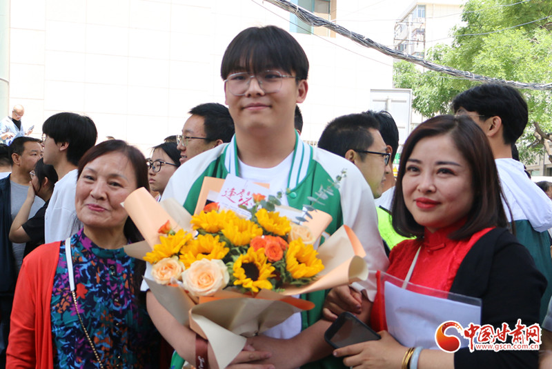 11時40分,考試結(jié)束鈴聲響起,首場語文考試順利結(jié)束,考生陸續(xù)走出考場。不少場外等待考生的家長,手里拿著花束,為考生們加油鼓勁。