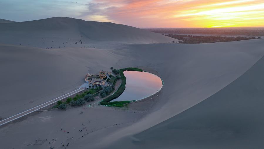 這是6月6日拍攝的鳴沙山月牙泉(無人機(jī)照片)。新華社記者 郎兵兵 攝