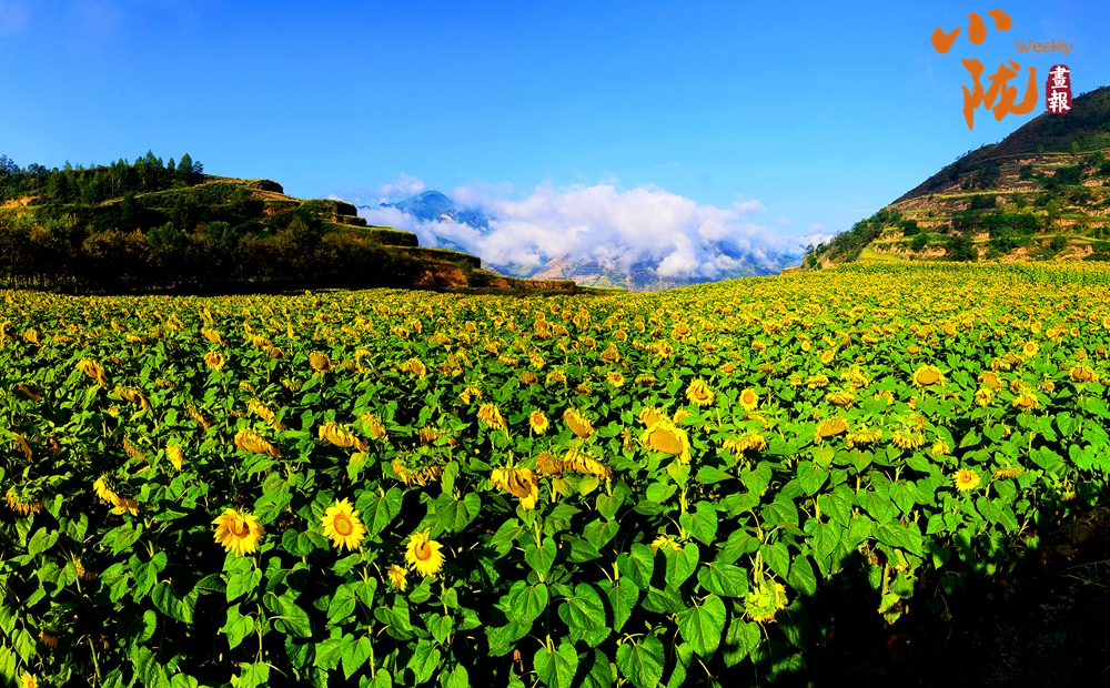 盛開的向日葵,迎著朝陽,競(jìng)相綻放,婀娜多姿,在藍(lán)天白云下,卷起花的浪朵,匯聚成碧波蕩漾、金光閃閃的海洋,讓人心曠神怡。