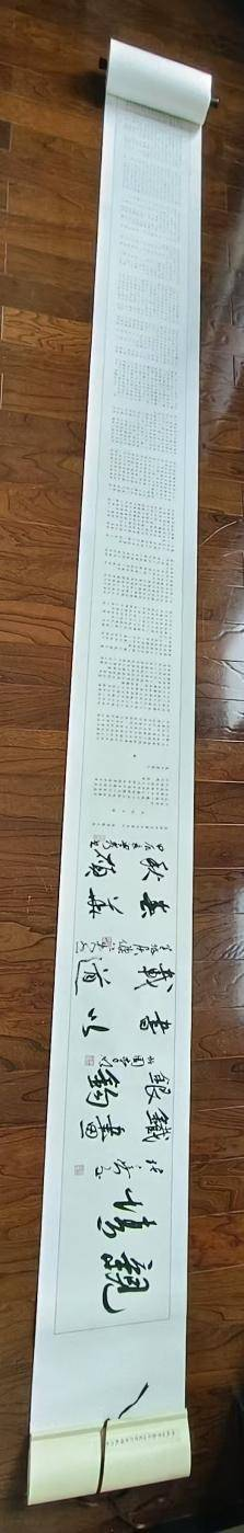 該長卷是白建新繼200米硬筆書法長卷《蛙》之后的又一部力作。作者耗時一年四個月,用硬筆楷書在四尺對開的宣紙上創(chuàng)作的《海峽兩岸著名作家系列 親情散文卷》,字體嚴謹,書風純正,字形一厘米見方,盡顯歐楷風體。全篇近30萬字,共分5卷,幅長達250米。