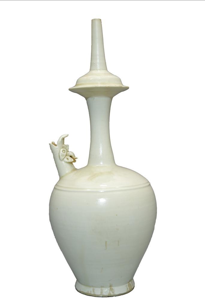 胎白質(zhì)細(xì)堅致,釉白泛黃,底足無釉。采用堆塑技法,小口長頸,頸中部飾一相輪狀圓盤,下頸束腰,圓肩鼓腹下收,圈足外撇。肩腹交接處飾弦紋三道,肩的一側(cè)塑龍首流。