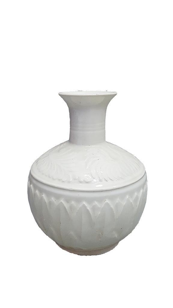 胎白質(zhì)細(xì)堅致,釉白瑩潤光亮。采用刻花技法。長頸呈喇叭口,圓唇。頸中部飾凹弦紋三道,器內(nèi)無釉。圓肩飾左右對稱的菊花紋,前后飾方向一致的菊葉紋。肩腹交接處飾凹弦紋一道,腹稍鼓下收,腹?jié)M刻三疊仰蓮紋。矮圈足,足底無釉,修足刀削痕明顯。
