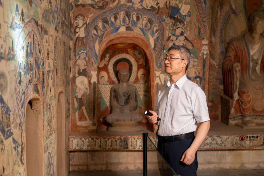 趙聲良在莫高窟第285窟(復制窟)中做學術(shù)考察。敦煌研究院 供圖