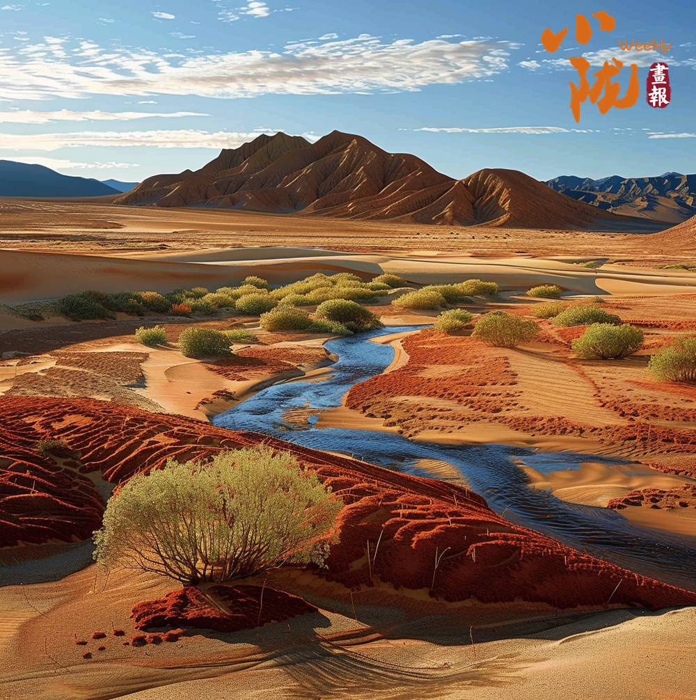 一叢叢紅柳宛如流動(dòng)的彩云,在這蒼茫的戈壁灘上盡情綻放。這種看似平凡卻又充滿生命力的植物,與藍(lán)天白云相映,與沙丘中一蓬蓬的綠色為伍,為這粗狂的戈壁帶來了無(wú)限生機(jī)。