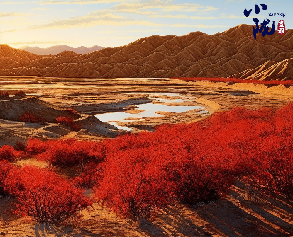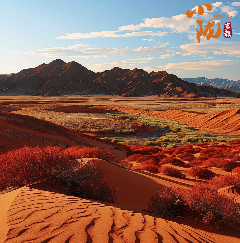 沙漠的沙粒在晚霞的映射下變得金黃而溫暖,仿佛覆蓋了一層光暈。遠(yuǎn)處的山峰也被晚霞點(diǎn)亮,宛如一座座火焰般迎接著夜晚的到來。