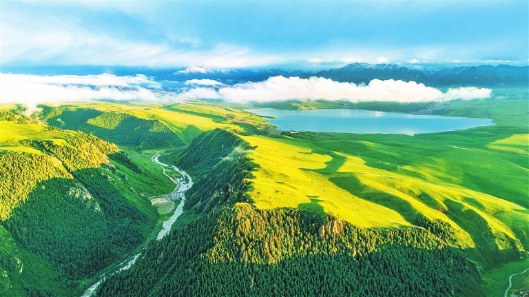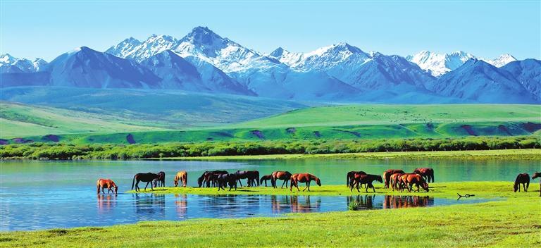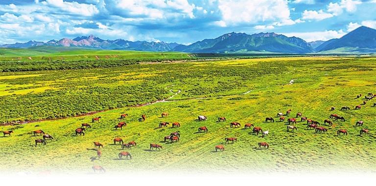 白雪皚皚的祁連山下,一眼望不到邊的大片牧草青翠碧綠,色彩斑斕的野花競(jìng)相開放,擁有百萬(wàn)畝草原的山丹馬場(chǎng)如巨幅彩色畫卷徐徐展開。