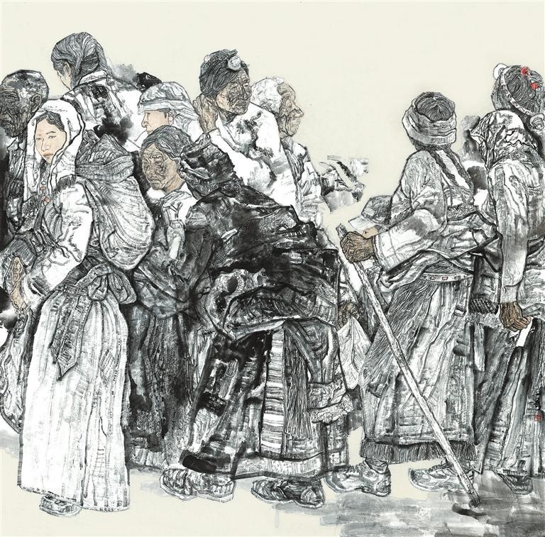 作品《趕集》主要描繪了不同年齡階段的人物聚集一起趕集的一幕,以筆墨求真的態(tài)度,通過不同的形象去表現(xiàn)人物的真善美。在落墨前,我對(duì)人物造型和畫面形式結(jié)構(gòu)反復(fù)推敲打磨,力求作品更有溫度和厚度。