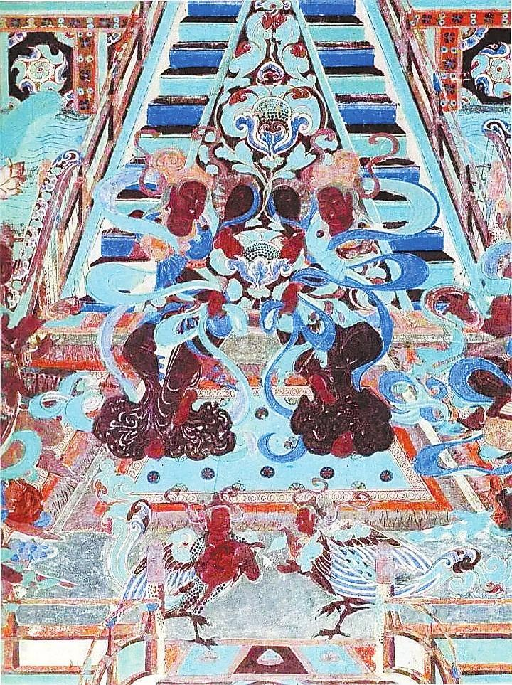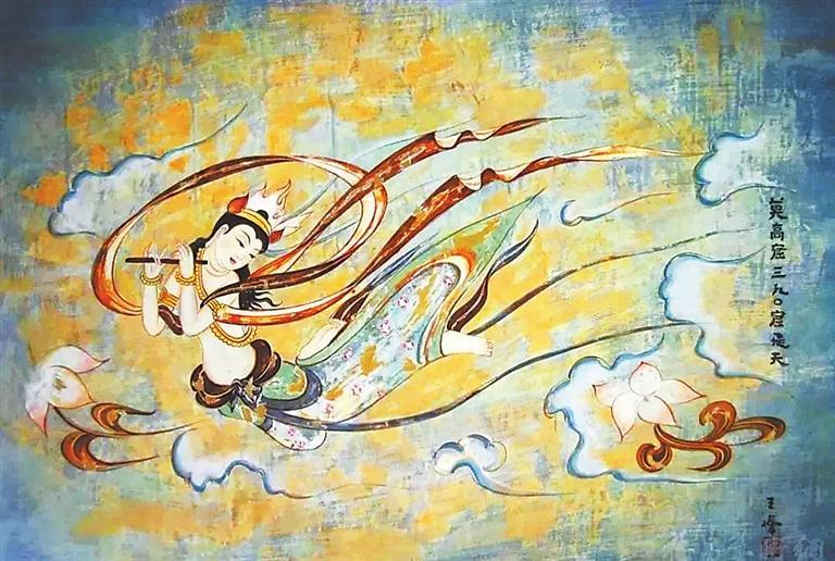 敦煌莫高窟,窟窟有壁畫(huà),拼接起來(lái)長(zhǎng)達(dá)45000多平方米,有世界上“最大畫(huà)廊”之稱(chēng)。這些壁畫(huà)中,幾乎每幅都有舞蹈形象,如在窟頂、龕楣、藻井遨游的飛天,憑欄上的天宮伎樂(lè),經(jīng)變畫(huà)中的娛佛、敬佛的獻(xiàn)舞者——伎樂(lè)天,出行圖中跳著具有濃郁生活氣息的世俗樂(lè)舞,以及富有舞蹈美感的彩塑菩薩、天王力士等,琳瑯滿(mǎn)目,精妙絕倫。這些舞蹈形象充分反映了從十六國(guó)北朝至元代千余年來(lái)不同歷史時(shí)期的舞蹈服飾、形態(tài)、風(fēng)貌,為我們挖掘、整理、弘揚(yáng)中華民族舞蹈文化提供了十分珍貴的形象資料。