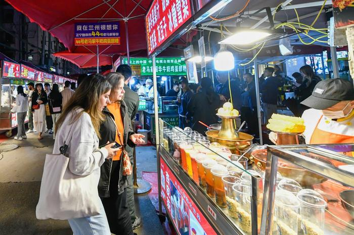 游客在蘭州市城關(guān)區(qū)正寧路小吃夜市選購特色美食。新華社記者 郎兵兵 攝
