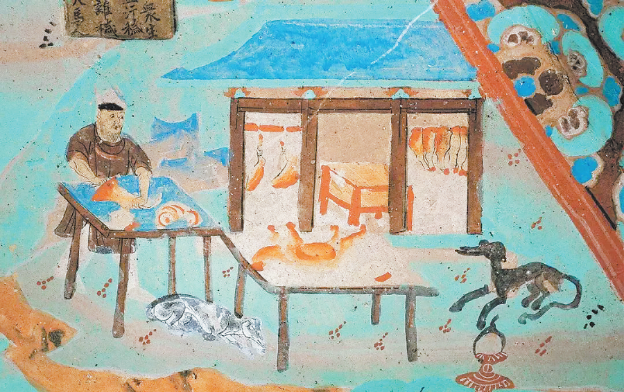 提起西北的美食,就少不了肥美牛羊肉。畜牧業(yè)發(fā)達(dá)的敦煌,這些優(yōu)質(zhì)的肉類絕不會(huì)斷貨。莫高窟第61窟、第85窟、第156窟等,都出現(xiàn)了“肉鋪”的場(chǎng)面。