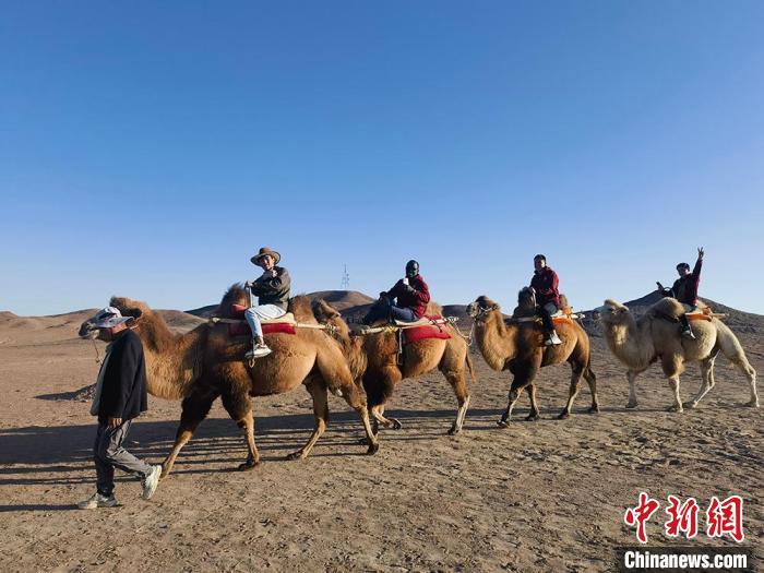 圖為留學(xué)生在陽(yáng)關(guān)景區(qū)體驗(yàn)乘騎駱駝。劉玉桃 攝