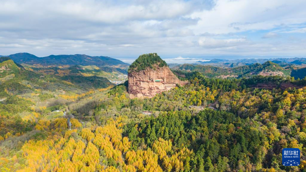 這是11月2日拍攝的麥積山石窟秋景(無人機(jī)照片)。新華社記者 陳斌 攝