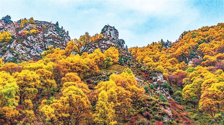 一場細(xì)雨,把漫山遍野深紅色與金黃色沖刷得更加明亮,透過秋霧的遠(yuǎn)山,伴著秋雨的落葉,石門溝別樣的秋景令人心曠神怡。看著眼前的景象,不由得想到初夏的石門溝,那時(shí)的石門溝,滿山的杜鵑花開得正旺,遠(yuǎn)遠(yuǎn)望去,山坡就像是從天而降的紫色瀑布。而深秋的石門溝,卻是另一番景象。
