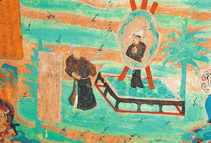 戰(zhàn)國時期楚國詩人屈原在《漁父》一文中寫道:“吾聞之,新沐者必彈冠,新浴者必振衣。安能以身之察察,受物之汶汶者乎?”意思是說我聽說剛洗過頭的人一定會去彈彈帽子上的灰塵;剛洗過澡的人一定要抖抖衣服的灰塵。怎能讓清白的身體去接觸世俗塵埃的污染呢?當年的敦煌人走出溫泉,在身心放松之后,就該靜觀返照自己了。在莫高窟第85窟中有一幅“曲花式鏡圖”:畫面上在一個正方形鏤空的底座上擺放著一個巨大的曲花式鏡,鏡子式樣別致,明亮澄澈。藍色的曲花式樣引人矚目。但畫面上最吸睛的是一位魁梧俊朗身著一襲赭色長袍的男子,他正在鏡子前仔細地打量自己,而鏡中映射出他神情凝重的情態(tài)來。原來,古人照鏡除了正衣冠之外,還有反觀自照的含義,在鏡子前良久地注視自己,就是對自己反省、頓悟的過程。“一年好景君須記”,走過四季,到了歲末,該是每個人回望來時路,展望前方的時候了。
