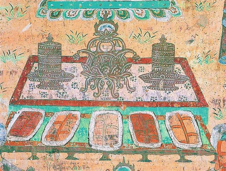 宋朝詩人陸游在《食粥》一詩中寫道:“世人個個學長年,不悟長年在目前。我得宛丘平易法,只將食粥致神仙。”意思是說人人都期盼長壽,怎么也沒有想到,我就成了長壽之人。如果讓我總結(jié)一下我長壽的秘訣,那就是我喝的粥多而已。想想冬天到了,天寒地凍,喝碗粥,渾身上下暖烘烘的多美啊??墒窃诙鼗捅诋嬂铮藗冊诙静皇呛戎?,而是喝熱牛奶。在莫高窟第146窟壁畫中有一幅“擠牛奶圖”:畫面上一頭健碩的母牛正在被人擠奶,它回首望向擠奶者。在它的身下,還有一只小牛犢正貪婪地望著擠奶者。兩頭牛都憨態(tài)可掬、萌蠢可愛。漫天飛雪中,煮沸的牛奶溫暖著漫長冬季的每時每刻。在莫高窟第302窟中有一幅“湯水浴圖”。湯水就是溫泉。畫面上在樹木掩映之下有一池溫泉,有一大一小兩個人正沉浸在溫泉沐浴的歡快之中??梢?,伴著紛飛的大雪泡個溫泉,不是只有今天才有的享受;在千年之前的敦煌,人們就已經(jīng)開始修建溫室浴池,而且引水排水的技術(shù)已經(jīng)較為完善。院落依依、親朋融融、池水湯湯、筋骨軟軟,逸興悠悠。
