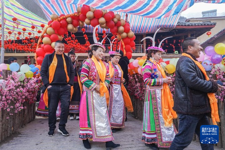 2022年1月13日,在隴南市文縣鐵樓藏族鄉(xiāng)寨科橋村,婚禮宴席結(jié)束后賓客到村寨中走親訪友。新華社記者 郎兵兵 攝