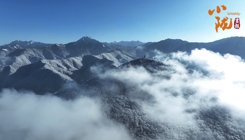 云霧繚繞中,太子山主峰巍峨壯觀(guān),翠色與白雪交織,綿延起伏的山巒溝壑被銀裝緊緊包裹,閃爍著迷人的光芒。