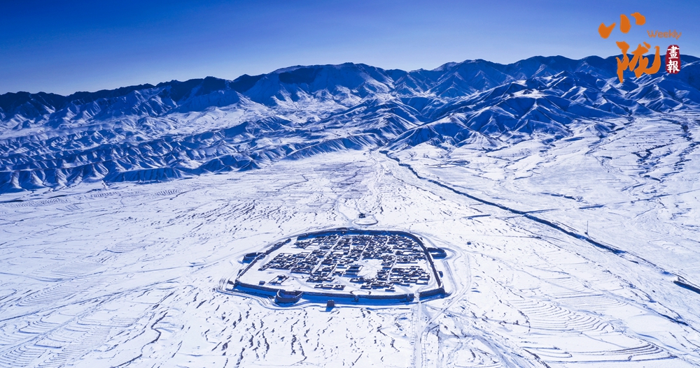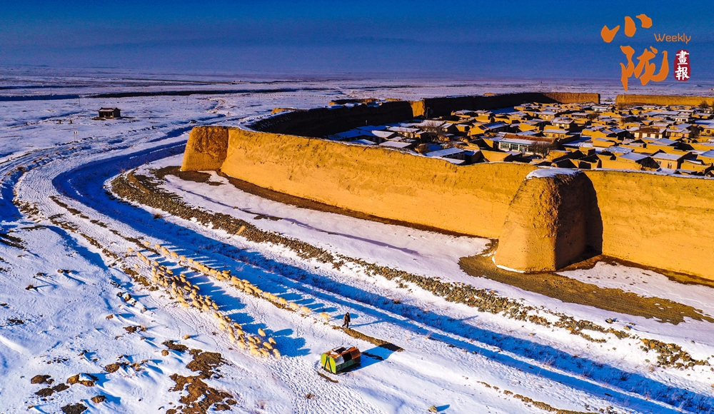 陽(yáng)光照耀著古城墻,閃爍著淡淡的金光。羊群回歸古城,在白雪覆蓋的戈壁灘留下了串串蹄印,生命的希望就在潔凈的雪中孕育。