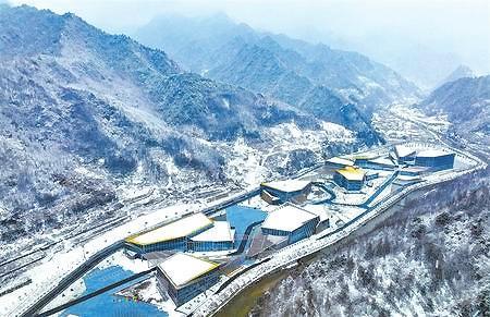 從縣城驅(qū)車不過半小時的車程,一路青松白雪,生機盎然。在游客中心,只見一大片水面倒映山川,文房四寶寫意排布,“四水歸堂”巧奪天工,龍軀接連兩岸山勢,天地舒卷,日月提筆,步履為印,山水著墨,我們決定從這里開啟冬日青龍山之旅。