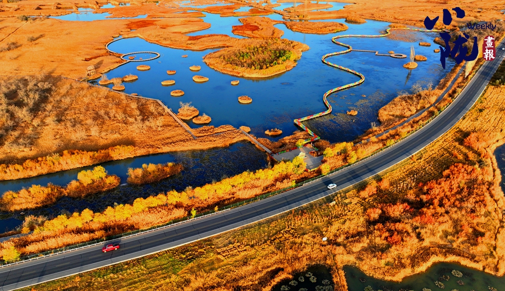 公路穿越濕地公園,蘆花舞動,碧水環(huán)繞,形成一條美麗的“金色大道”。