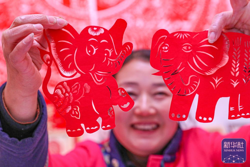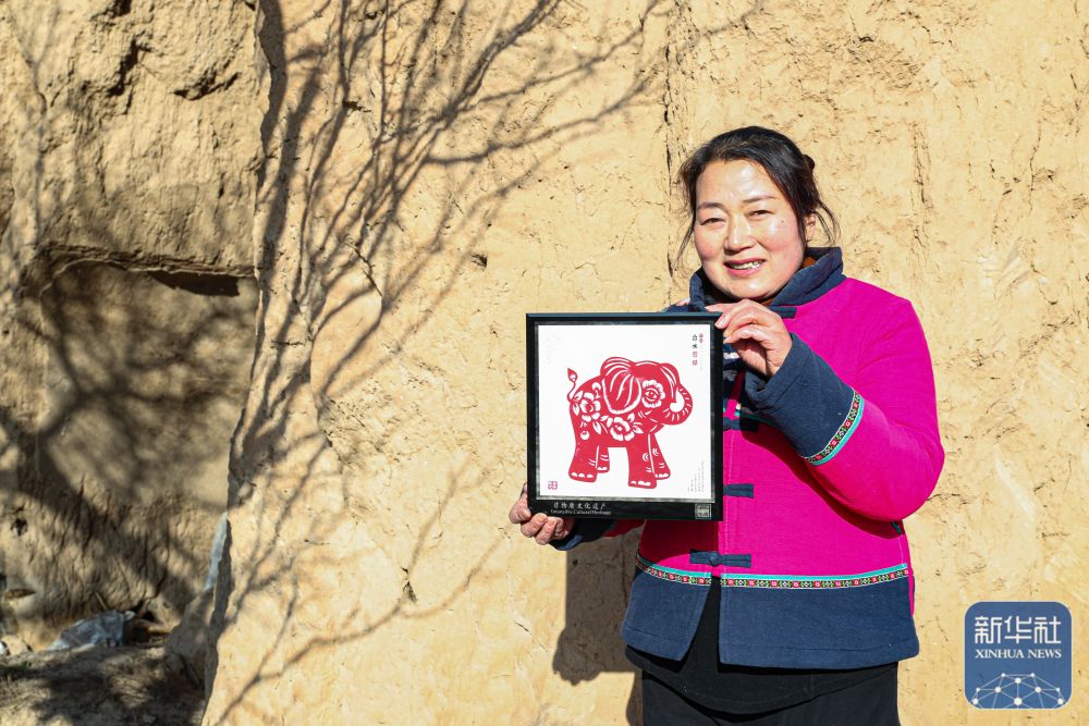 1月4日,在慶陽市合水縣西華池鎮(zhèn)唐旗村,張雪峰展示黃河古象主題剪紙作品。