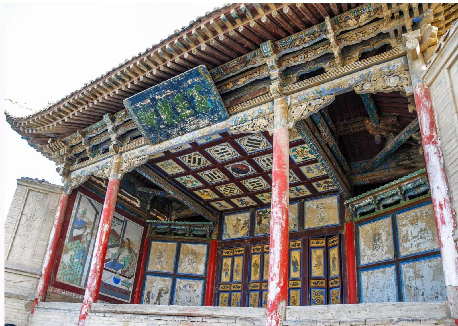 關(guān)帝廟戲樓(現(xiàn)存),關(guān)帝廟又稱武安王廟。明朝中期修建,萬歷六年(公元1578年)奉命鎮(zhèn)守嘉峪關(guān)的酒泉人佘動帶頭重修。乾隆五十七年(公元1792年),游擊將軍袋什衣主持重修,關(guān)帝廟戲樓是當(dāng)時守城官兵、城內(nèi)居民及過往商旅的娛樂場所。戲樓位于朝宗門斜對面,南閘門內(nèi)側(cè),關(guān)帝廟對面。它的形制是典型的中國傳統(tǒng)古典戲臺。關(guān)帝廟戲臺上就有一副意義深遠的對聯(lián),在兩側(cè)的八字屏風(fēng)磚上刻有:“離合悲歡演往事,愚賢忠佞認當(dāng)場。”
