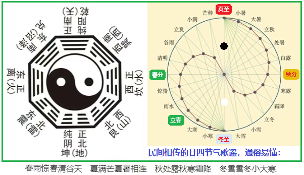 八卦是中華先民理性思維和高度智慧的結晶。華夏7000年前伏羲創(chuàng)制的八卦圖最初是用來分時紀年的,而在此基礎上發(fā)展起來的廿四節(jié)氣后來卻大放異彩。所謂“太極生兩儀,兩儀生四象,四象生八卦”的陰陽變化,其實指的就是四季輪替,它代表了事務孕育、發(fā)展、成熟和衰亡的自然規(guī)律,告訴世人“變化,才是永恒不變的規(guī)律”這一本質(zhì)!如果在八卦圖上繼續(xù)往下切分,就能很自然地從八卦圖上得到廿四節(jié)氣(見圖)。