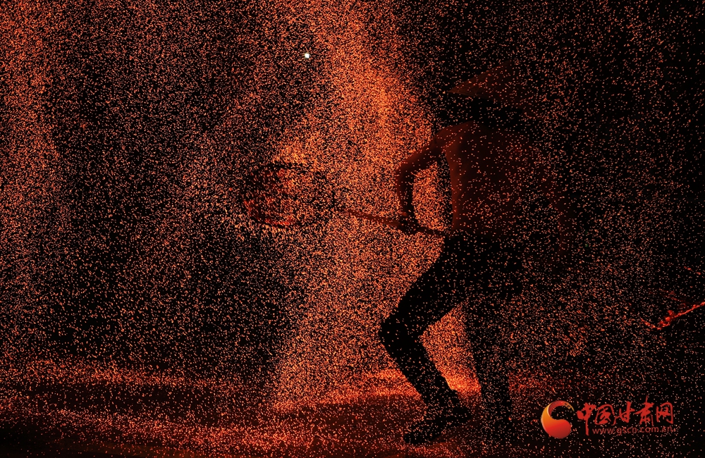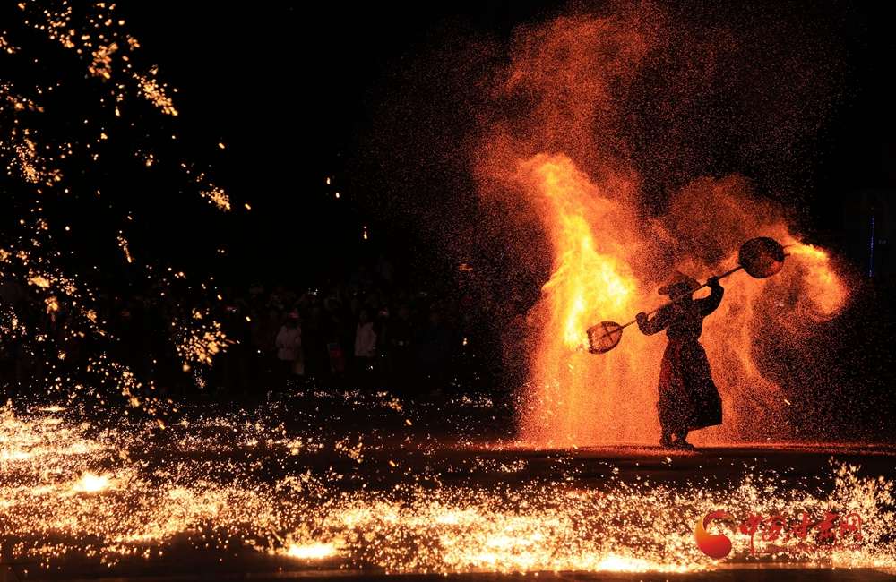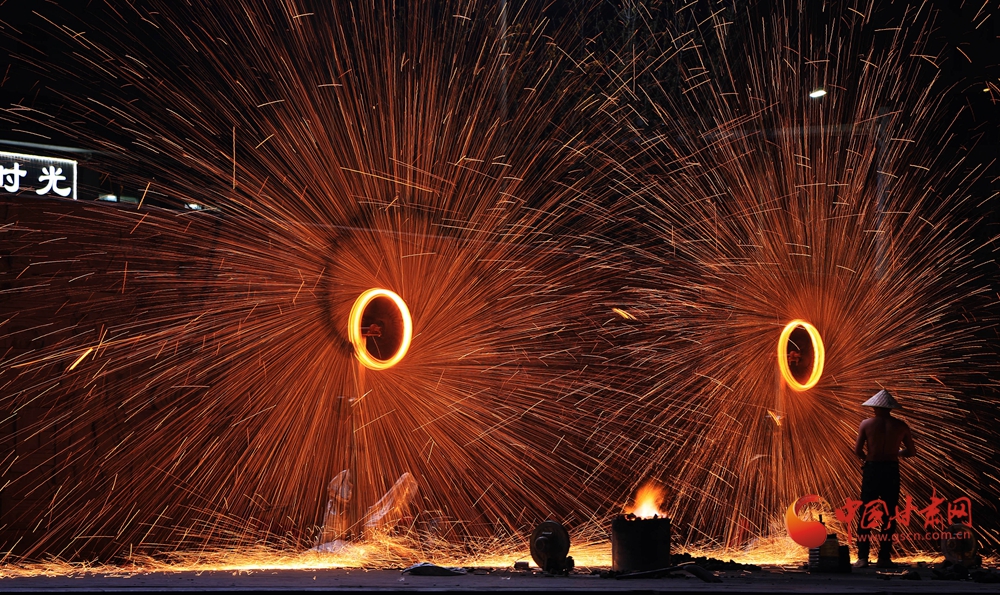 打鐵花表演時(shí),傳承人將生鐵熔到1600℃高溫后,把鐵汁注入“花棒”,用撬棍或木鍬猛擊,使鐵水打上天空四散,形成璀璨絢麗的火樹銀花景觀。