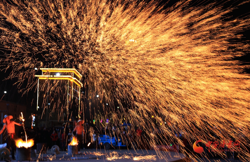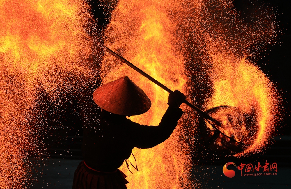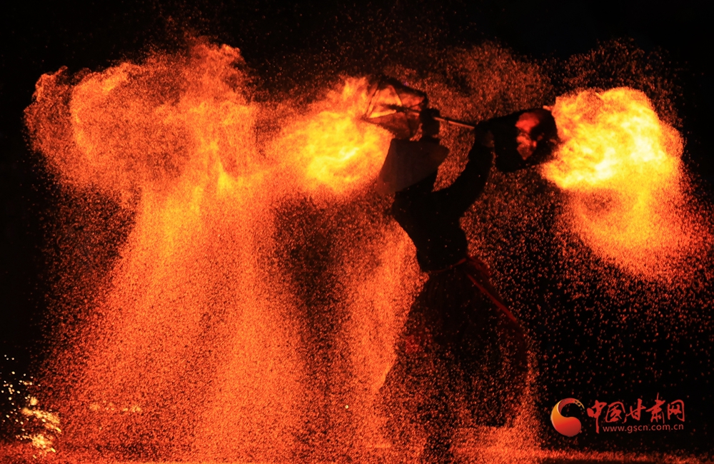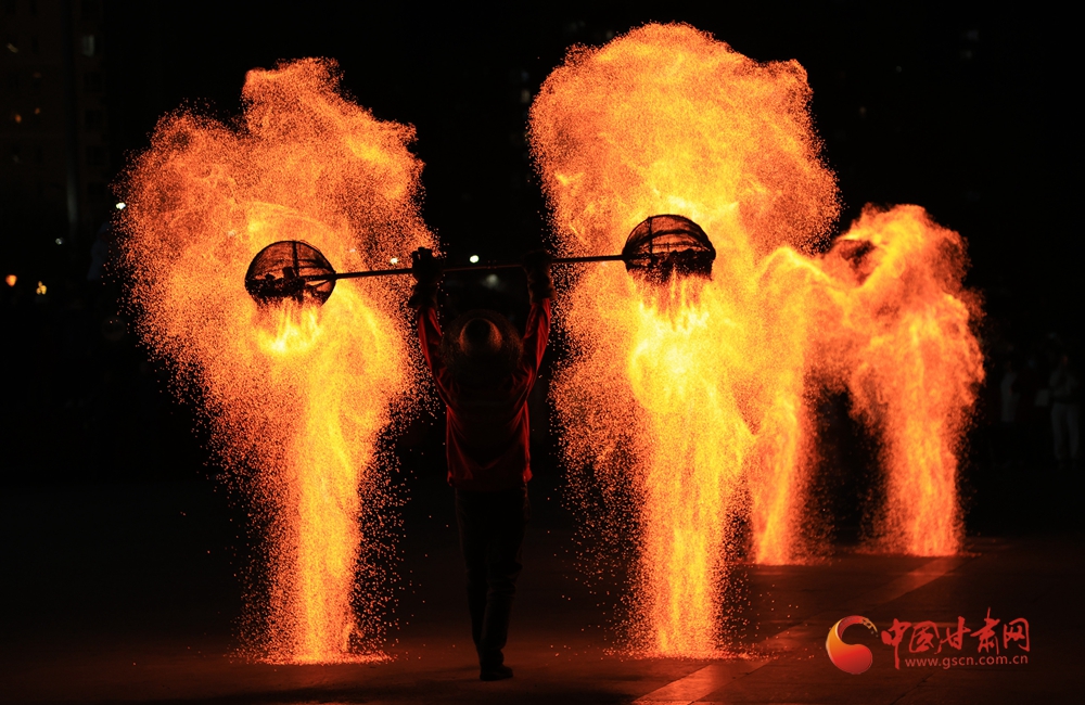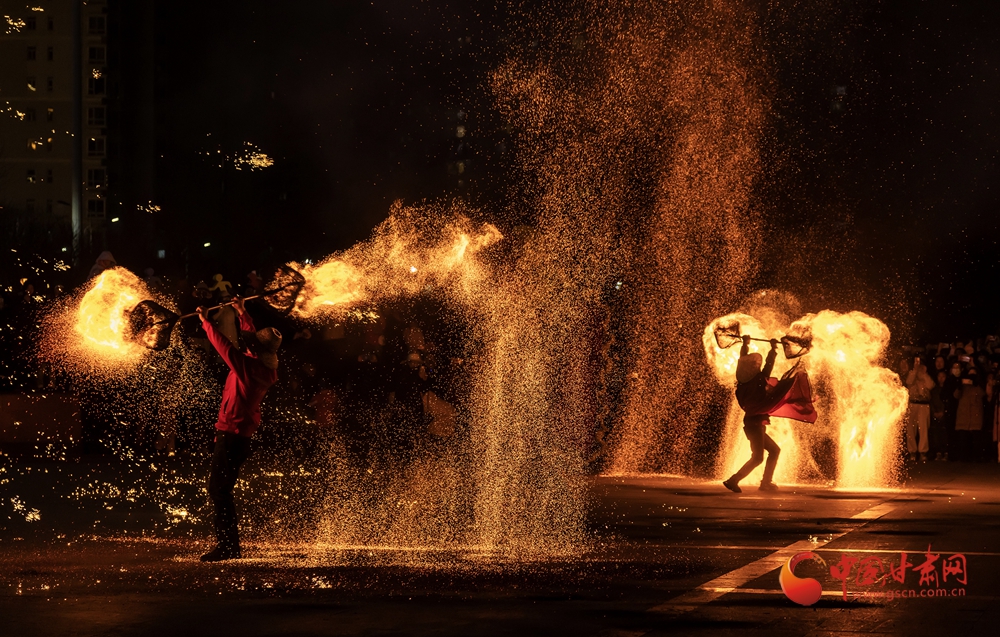 春節(jié)期間,在臨夏永靖劉家峽太極廣場上進(jìn)行的打鐵花和火壺表演吸引了不少觀眾,營造了濃濃的節(jié)日氛圍。