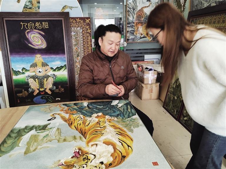 不遠(yuǎn)處的刻葫蘆攤位前,非遺代表性傳承人阮熙越運(yùn)刀如筆,在打磨光潤的葫蘆表面刻出圖案。“刻針深淺決定墨色濃淡,蘭州葫蘆皮質(zhì)厚實(shí),才能承載這樣的藝術(shù)語言。”正在體驗(yàn)刻繪的大學(xué)生張萌說。從傳統(tǒng)書畫到現(xiàn)代動漫IP,從擺件到車掛,近幾年刻葫蘆在創(chuàng)新中走向大眾。據(jù)文旅部門統(tǒng)計(jì),非遺購物月期間刻葫蘆銷售火熱,成為最受游客青睞的“蘭州名片”。