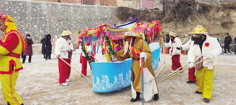 旱般表演時節(jié)奏由慢漸快,闖激流、過險灘,同時,彩扇、華燈秧歌隊(duì)協(xié)同表演,并以《十道河》《迎春歌》等伴唱,用三弦、二胡、笛子等伴奏的隴上民間小調(diào)烘托氣氛。