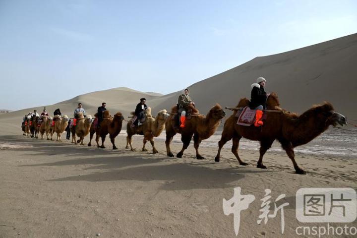 2025年3月2日,游客在甘肅省敦煌市鳴沙山月牙泉景區(qū)游覽。