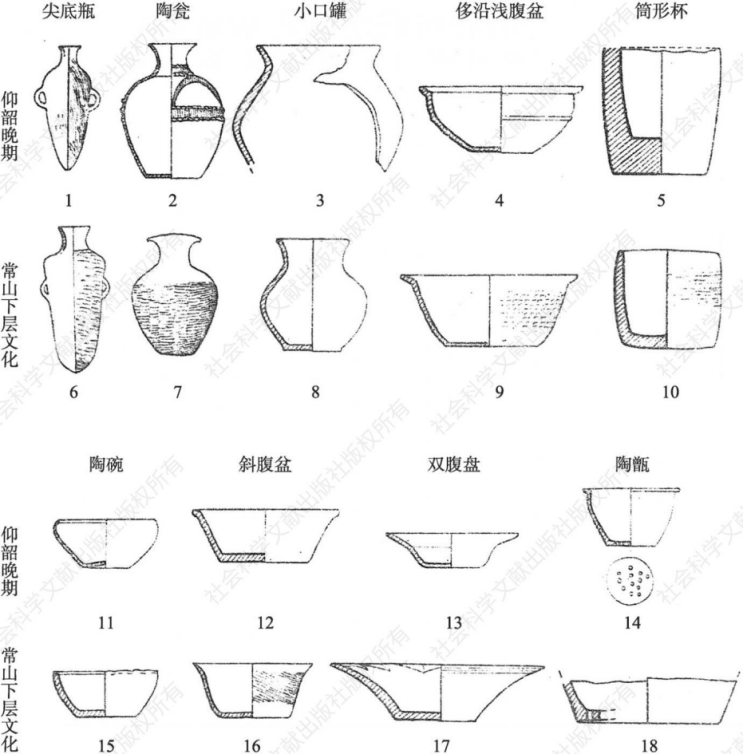 在文化傳承方面,以往認為甘肅東部地區(qū)原始文化發(fā)展序列是從仰韶文化經(jīng)馬家窯文化(含石嶺下、馬家窯、半山和馬廠四個類型)再到齊家文化,且常山下層文化源于馬家窯文化馬家窯類型。近年郎樹德先生提出新序列是老官臺文化(大地灣遺址一期)→仰韶文化早期(半坡類型、大地灣遺址二期)→仰韶文化中期(廟底溝類型、大地灣遺址三期)→仰韶文化晚期(大地灣遺址四期)→常山下層文化(大地灣遺址五期)→齊家文化,認為常山下層文化源頭是仰韶文化而不是馬家窯文化,且是齊家文化的重要源頭之一,糾正了齊家文化是馬家窯文化馬廠期發(fā)展來的不嚴謹說法,還認為隴東地區(qū)沒有齊家文化的遺存,類似齊家的器物其實就是常山下層文化。還有學(xué)者認為寧夏南部的“齊家文化”(菜園文化)與典型齊家文化有差異,且與常山下層文化更接近,應(yīng)歸屬于此。但學(xué)界普遍認為常山下層文化繼承仰韶文化之后,在向西擴展過程中,與當(dāng)?shù)赝林幕嗷ソ蝗?,逐漸演變?yōu)楠毦咛厣牡胤椒种?。從考古發(fā)現(xiàn)來看,常山下層文化應(yīng)屬龍山早期文化遺存,在發(fā)展進程中,與關(guān)中地區(qū)的案板三期文化相互交流,同時向東對客省莊二期文化的形成產(chǎn)生了一定影響。不可否認,齊家文化在形成過程中,受到客省莊二期文化和馬廠文化的深刻影響,呈現(xiàn)出多元融合的態(tài)勢。故而,1979年常山遺址的發(fā)掘及“常山下層文化”的命名,為探尋渭河流域仰韶文化的發(fā)展走向以及齊家文化的起源,開辟了全新路徑,為構(gòu)建甘肅東部地區(qū)新石器考古文化編年體系提供了關(guān)鍵依據(jù)。