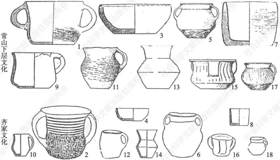 常山下層文化過去限于資料太少,對其研究進展緩慢,近年來很多學(xué)者研究有了新的突破。陶器在常山下層文化中獨具特色,橙黃色、紅褐色陶器搭配斜行籃紋,成為其顯著特征。諸多齊家文化器物,如豎行籃紋單耳罐、單耳杯、雙耳杯、侈口罐等,皆可在常山下層文化中尋得淵源,胡謙盈據(jù)此提出“常山下層文化是齊家文化的重要來源”,張忠培亦認為,常山下層文化的提出,有力推動了齊家文化淵源的研究。不過,學(xué)界對于齊家文化的起源尚存爭議,有人認為齊家文化是馬廠類型的的延續(xù)與發(fā)展,也有人認為是獨立發(fā)展而成,還有人認為是馬家窯文化發(fā)展到馬廠類型后分東西兩支,一支發(fā)展為河西的四壩文化,一支發(fā)展為齊家文化。韓建業(yè)先生認為齊家文化應(yīng)當(dāng)是客省莊二期文化西進隴東南并與菜園文化融合的結(jié)果,齊家文化早期的絕對年代約在公元前 2400-前 2200 年,這個時段在中國內(nèi)地屬于銅石并用時代晚期,分布在天水一帶的遺存是齊家文化早期階段,常山下層文化絕對年代約在公元前2700-前2400年,相當(dāng)于廟底溝二期階段,再向下就屬于齊家文化早期階段。 近年來,大多學(xué)者提出齊家文化源頭大致在隴東及寧夏南部,由東向西漸進擴展。