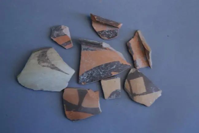 常山下層陶器的籃紋、彩陶和彩繪獨具特色?;@紋均橫行或斜行施于器壁,常見籃紋窄小且拍印深,可能是黃土高原溝壑地帶稀樹叢林藤條編織器物在陶器紋飾上的獨特反映?;@紋陶器大多器型精美且較大,如橙黃色籃紋高領(lǐng)深腹罐,當(dāng)屬上流社會使用的器物。彩陶以赤砂石為顏料,因顏料調(diào)和濃度大且未經(jīng)壓磨,棕紅色彩紋直接裸露于器皿壁面,與仰韶、馬家窯等文化彩陶著彩后壓磨光滑的工藝截然不同。彩繪所用顏料與色澤雖與彩陶相同,但彩繪施于燒制后的器皿上,極易脫落。