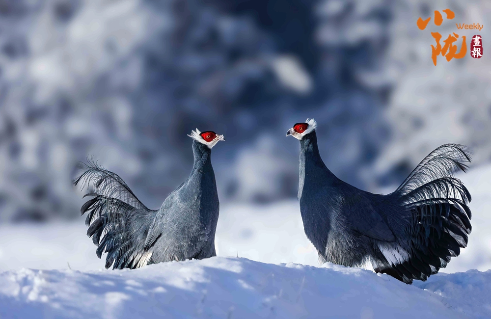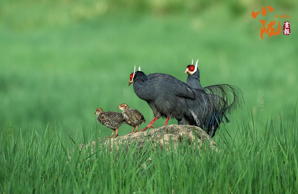 珍貴稀有的國家二級重點(diǎn)保護(hù)動物藍(lán)馬雞,體型較大,通體藍(lán)灰色,頸項(xiàng)和肩部顏色更深,閃爍著金屬般的輝亮。其尾羽特別長,由灰藍(lán)色漸變?yōu)榘底纤{(lán)色,并渲染著金屬綠和金屬紫藍(lán)色,24枚尾羽中,中央一對尾羽特別長,富有彈性,彎曲成一個(gè)美麗的弧形,高高地翹在其他尾羽之上,披散下垂如馬尾,因而得名。此外,藍(lán)馬雞的頭側(cè)緋紅,耳羽簇白色并突出于頸部頂上,為其增添了獨(dú)特的魅力。