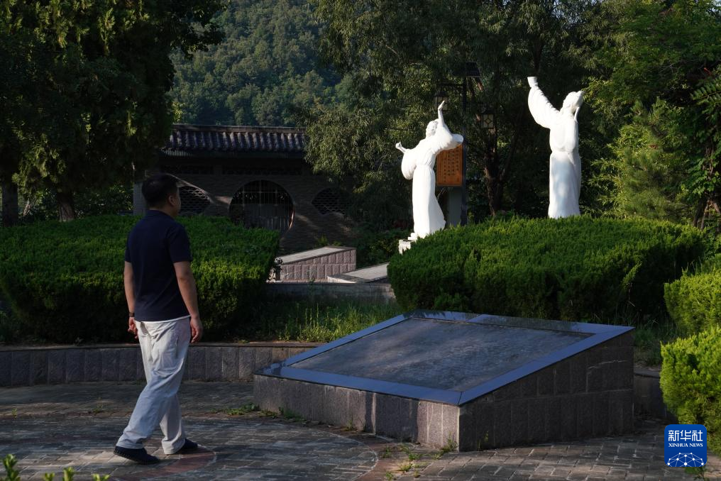 7月14日,在甘肅省隴南市徽縣大河店鎮(zhèn)青泥村,游客觀賞李白和杜甫的雕塑。新華社記者 馬寧 攝