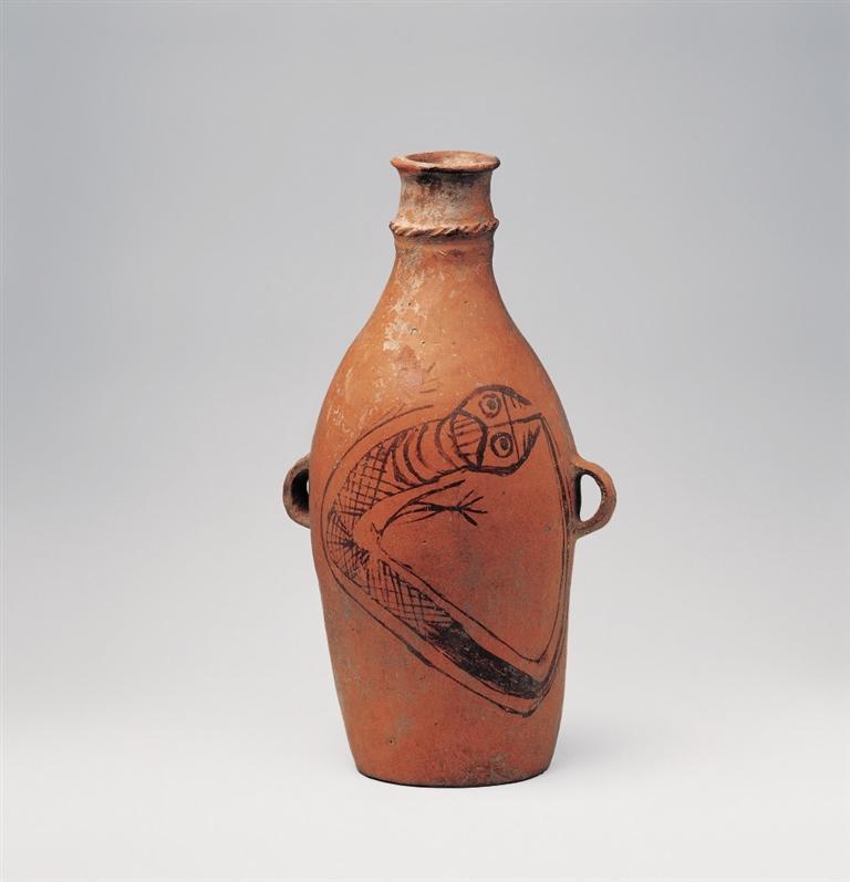 仰韶文化石嶺下類型(距今5200年前)甘谷縣西坪出土高38.4厘米,口徑7厘米,底徑12厘米。小口、長頸、平底、腹上部有雙耳,頸部有堆紋一圈。瓶腹繪黑色人首形的鯢魚圖樣,一雙短臂向外伸出,全身為斜格紋,尾部彎曲。