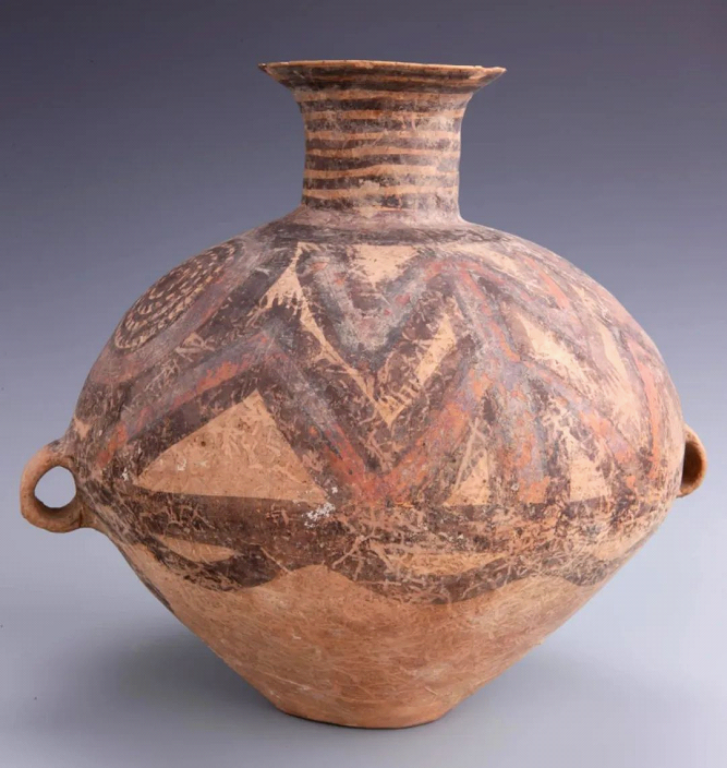 彩陶蛙紋壺,新石器時(shí)代馬家窯文化馬廠類型,高42厘米,口徑13.1厘米。壺泥質(zhì)紅陶,口外侈,薄唇,球形腹,小平底,腹部?jī)蓚?cè)對(duì)稱置雙系。于橙紅色陶衣上以黑彩描繪變形蛙紋。圖案線條流暢,富于變化,與造型協(xié)調(diào)一致。據(jù)科學(xué)測(cè)試,馬家窯文化馬廠類型彩陶的年代約為公元前2200~前2000年。變形蛙紋作為馬家窯文化馬廠類型彩陶上常見(jiàn)的裝飾紋樣之一,體現(xiàn)了遠(yuǎn)古人們對(duì)于繁衍生殖的渴望。青蛙產(chǎn)下許多卵,孵出許多蝌蚪,正是繁衍旺盛的象征。