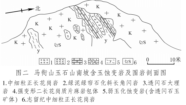 馬銜山玉礦分布在馬銜山東南部的玉石山(圖版一),海拔3028米。山上出露的地質(zhì)體主要為古元古界馬銜山巖群、中元古代片麻二長花崗質(zhì)巖[3]和志留紀(jì)正長花崗巖及正長巖。馬銜山巖群的巖性為黑云斜長片麻巖、變粒巖、斜長角閃巖和白云質(zhì)大理巖,巖石普遍遭受了韌性變形,變余糜稜巖發(fā)育。志留紀(jì)巖漿侵入期后熱液活動(dòng)較強(qiáng),石英脈細(xì)脈發(fā)育,局部見螢石礦化或礦床[4]。玉礦化主要產(chǎn)于馬銜山巖群與志留紀(jì)正長花崗巖和正長巖接觸帶上(圖版二),具體賦存在與白云質(zhì)大理巖的接觸部位,是正長花崗巖及正長巖與鎂質(zhì)大理巖接觸交代蝕變的產(chǎn)物[5]?;◢弾r與片麻巖、變粒巖和斜長角閃巖接觸界線附近巖石雖有蝕變,但不見玉化蝕變巖或玉石出露。在近山頂開采玉石揭露的一個(gè)地質(zhì)剖面清晰地顯示了這些特征(圖二)。該剖面大致呈東西走向,長約50米,馬銜山巖群多呈殘留體出露,斜長角閃巖綠泥綠簾石化強(qiáng)烈,大理巖普遍發(fā)生蝕變,形成透輝透閃石大理巖,緊靠花崗巖接觸地帶發(fā)育窄窄的透閃石玉礦帶?,F(xiàn)在人們找玉,也主要在該剖面上的花崗巖和鎂質(zhì)大理巖的接觸帶上鑿洞,在接觸帶上見有多處采挖玉石的洞穴。在該剖面西側(cè)約50米,發(fā)育有正長巖與大理巖的混染帶,肉紅色正長巖中包裹混染著大量灰綠色透閃透輝大理巖,部分已蝕變?yōu)橥搁W透輝石巖,且質(zhì)地較細(xì)膩,成為半玉化巖石。剖面和周圍地質(zhì)特征表明,玉礦的形成是早古生代志留紀(jì)花崗質(zhì)雜巖體侵入到古元古代鎂質(zhì)大理巖,發(fā)生接觸交代蝕變作用的結(jié)果,在兩種巖石接觸帶形成玉礦體。但并不是蝕變帶中的巖石都是透閃石玉石,透閃石玉在蝕變帶中多呈雞窩狀或不規(guī)則狀分布,少量呈脈狀出露。從剖面及部分采坑的規(guī)模來看,玉礦體向深處有變大、變好的趨勢,這主要受控于接觸面產(chǎn)狀,在傾角較緩處礦體相對(duì)較大。橫向上在背離接觸面方向圍巖具有從透閃石玉到透閃透輝石玉、透閃透輝石大理巖再到含透閃石大理巖的變化特征,反映了交代蝕變強(qiáng)度與接觸帶溫度及熱液成分變化的密切關(guān)系。從玉礦體到蝕變圍巖由于成分和結(jié)構(gòu)的變化出現(xiàn)一系列不同類型的玉石或巖石。我們?cè)谄拭嫔喜杉揭恍┬K的淡綠色玉料(圖版三)和出露較寬的微晶大理巖,經(jīng)偏光顯微鏡下薄片鑒定和XRF檢測,確定有透閃石玉、透輝透閃玉、透閃透輝石玉、透閃透輝石大理巖和含透閃石大理巖等,這與馬家窯遺址出土的齊家文化時(shí)期大部分玉質(zhì)品玉料類型基本一致[6]。部分地段近礦圍巖還有透輝石巖、透輝矽卡巖、矽卡巖化大理巖、蛇紋石化大理巖、斜長透輝石巖等。玉石山的采洞(坑)由于資源與環(huán)境保護(hù)的要求,大多已被填埋,但仍可見采坑殘留的位置。采洞(坑)均位于大理巖與正長花崗巖接觸帶靠近大理巖一側(cè),這也間接顯示了玉礦體的位置。此外,玉石山花崗巖中石英細(xì)脈較發(fā)育,局部可見螢石礦化,反映了花崗巖侵入期后低溫?zé)嵋夯顒?dòng)仍較強(qiáng),對(duì)玉礦也有一定的改造影響。