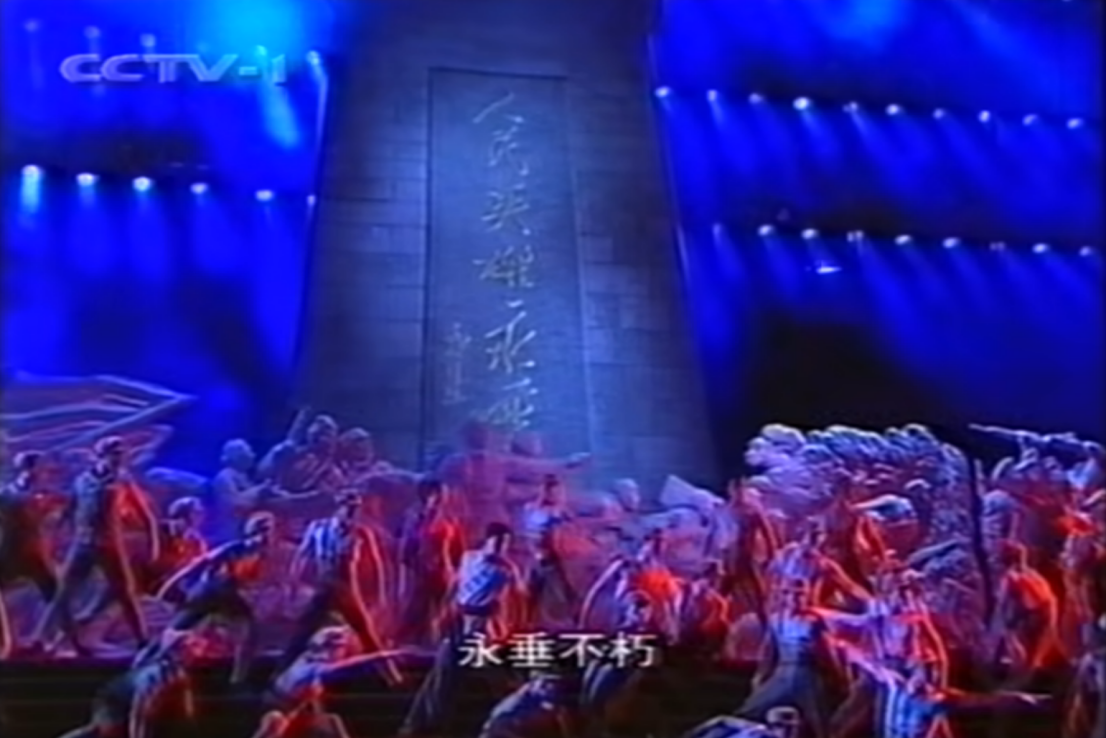 人民英雄紀(jì)念碑在舞臺上所承載的最主要的意象即歷史,而且特指1840年以后中國人民的革命歷史,其次是對英雄先烈的緬懷,演員們以解放軍裝束圍繞在人民英雄紀(jì)念碑下,呈靜默群雕的形象,姿態(tài)肅穆低垂,形成“紀(jì)念碑式”靜態(tài)場面,既是復(fù)刻靜止的浮雕形象,也是可供人敬仰的鮮活英雄。