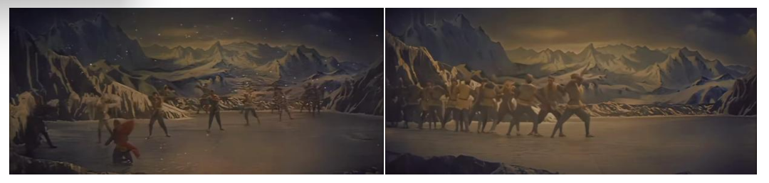 在表現(xiàn)行軍征程時(shí),舞者以身體前傾的大跨步姿態(tài),沿群山布景走出巨大的“S”型曲線。這不是簡(jiǎn)單的隊(duì)形變換,它首先在視覺(jué)上營(yíng)造出千軍萬(wàn)馬綿延不絕的雄渾意象。同時(shí),“S”形曲線本身藝術(shù)化地傳達(dá)了“道路是曲折的,前途是光明的”這一革命哲理。舞者整齊劃一、重心下沉的堅(jiān)定步伐,與沙幕光影營(yíng)造出的風(fēng)沙漫天效果相結(jié)合,共同體現(xiàn)紅軍在艱難險(xiǎn)阻中依然定向不移的鋼鐵意志。