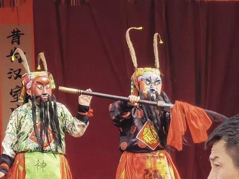 隴南市武都魚龍鄉(xiāng)陽山村高山戲又稱“演故事”“走過場”等,發(fā)源于隴南武都高山地區(qū),是從隴南當?shù)氐拿耖g祭祀活動和傳統(tǒng)社火中孕育、演變而來的戲曲劇種。高山戲演出程式多種多樣,語言生動活潑、幽默詼諧,2008年被列入第二批國家級非物質文化遺產保護名錄。停止演出近20年后,在當?shù)匚幕鞴懿块T的大力支持下,2022年正月陽山村恢復了高山戲的演出。