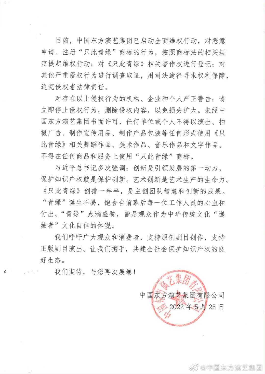 此次在聲明中,中國(guó)東方演藝集團(tuán)呼吁廣大觀眾和消費(fèi)者,支持原創(chuàng)劇目創(chuàng)作,支持正版劇目演出,攜手共建全社會(huì)保護(hù)知識(shí)產(chǎn)權(quán)的良好生態(tài)。