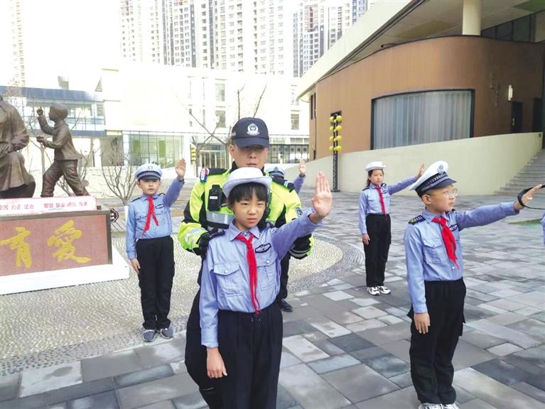 原標(biāo)題:交警課間進校園 教孩子們交通手勢操