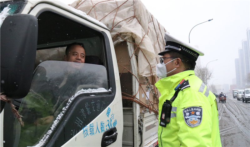 大隊(duì)領(lǐng)導(dǎo)實(shí)地查看道路通行情況,及時(shí)調(diào)整勤務(wù)模式和警力部署,確保降雪天氣各項(xiàng)安全“防控”措施落實(shí)到位。民輔警全員上路,強(qiáng)化重點(diǎn)路段巡邏管控和主要路口值守,對(duì)不具備通行條件車輛進(jìn)行勸返或提示繞行。通過(guò)鳴笛、喊話、閃爍警燈等措施,提醒駕駛員裝配防滑鏈,減緩車速、保持安全車距、注意觀察路面通行情況,引導(dǎo)車輛和行人安全有序通行。