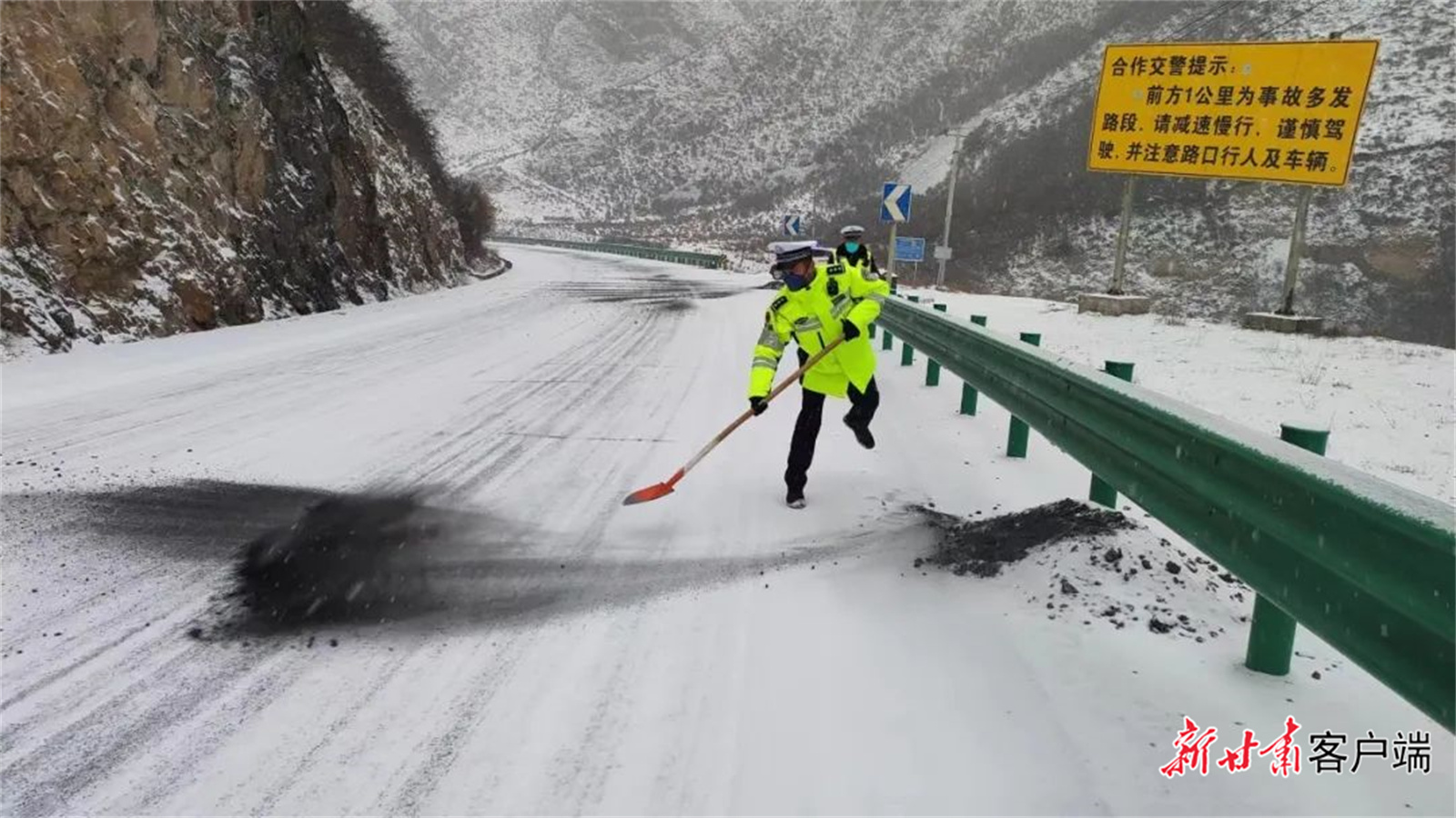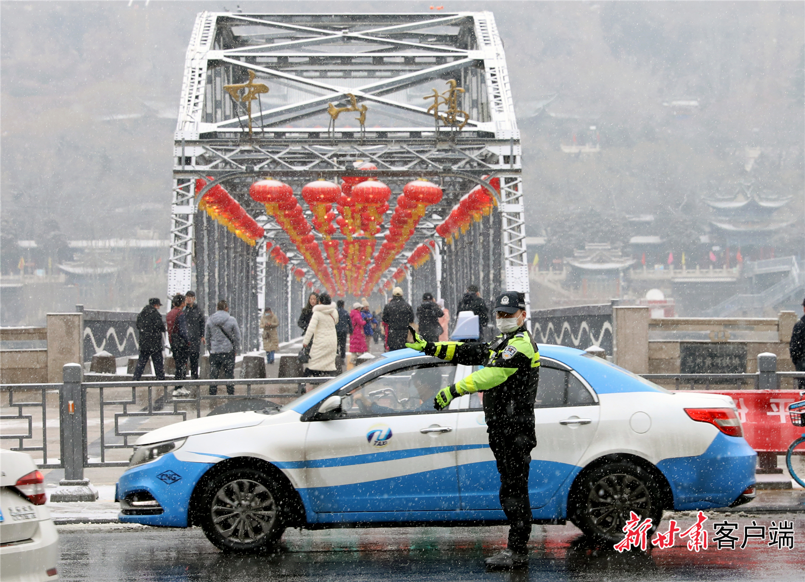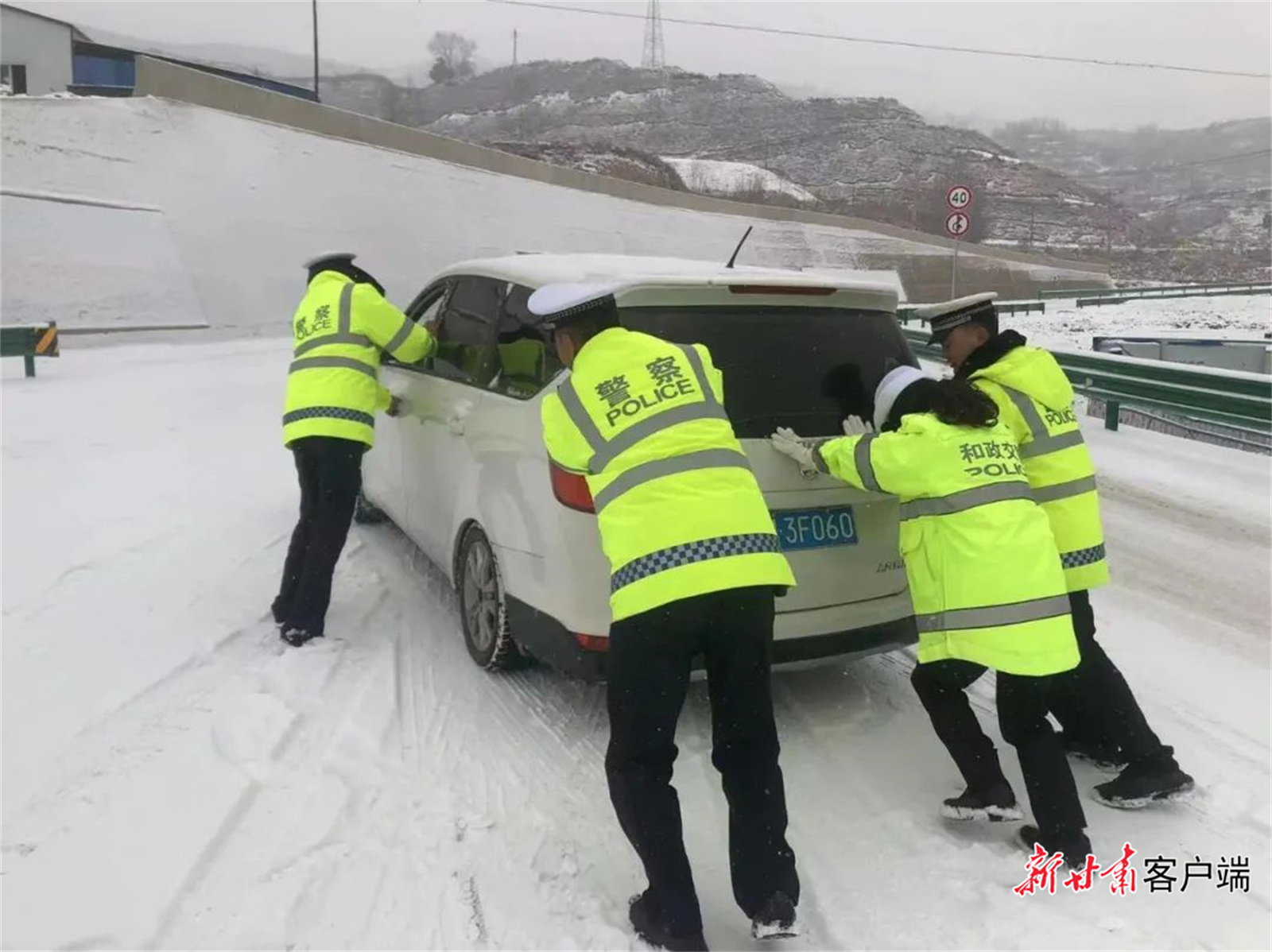 新甘肅客戶端訊(新甘肅·每日甘肅網記者 萬及敏)2月8日上午,甘肅多地出現(xiàn)降雪天氣,部分道路出現(xiàn)積雪結冰現(xiàn)象。為最大限度保障群眾出行安全,預防和減少道路交通事故的發(fā)生,全省公安機關1.2萬公安民輔警奮戰(zhàn)一線,加大重點路段巡邏管控力度,采取預警提示、除冰、引導車輛減速慢行、封閉道路、幫助群眾推車等措施,嚴防交通事故發(fā)生,為群眾的平安出行保駕護航。