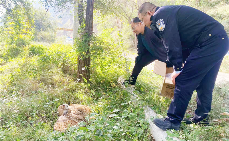 到達(dá)現(xiàn)場(chǎng)后,經(jīng)確認(rèn)該野生物種屬于國(guó)家二級(jí)保護(hù)動(dòng)物、雕鸮(貓頭鷹)。通過(guò)現(xiàn)場(chǎng)檢查,該貓頭鷹身體狀況良好,無(wú)外傷,活動(dòng)情況良好,具有野外生存能力,符合放生條件。于當(dāng)日,民警將其帶至野外放歸大自然。