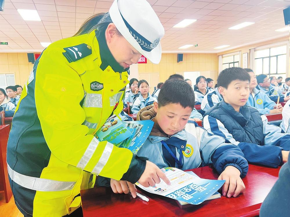民警向?qū)W生講解交通安全知識。2月26日,臨潭縣公安局交警大隊組織民警走進(jìn)臨潭縣回民中學(xué),開展交通安全進(jìn)校園宣傳活動。 新甘肅·甘肅法治報記者金凡裕攝