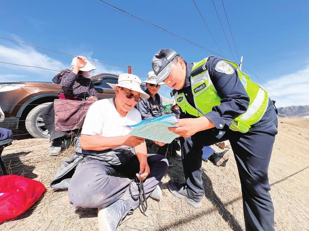 民輔警向群眾講解交通安全知識。近日,碌曲縣公安局交警大隊民輔警借助夏澤灘春季賽馬活動有利時機,開展“美麗鄉(xiāng)村行”交通安全巡回宣傳活動。 新甘肅·甘肅法治報記者金凡裕攝
